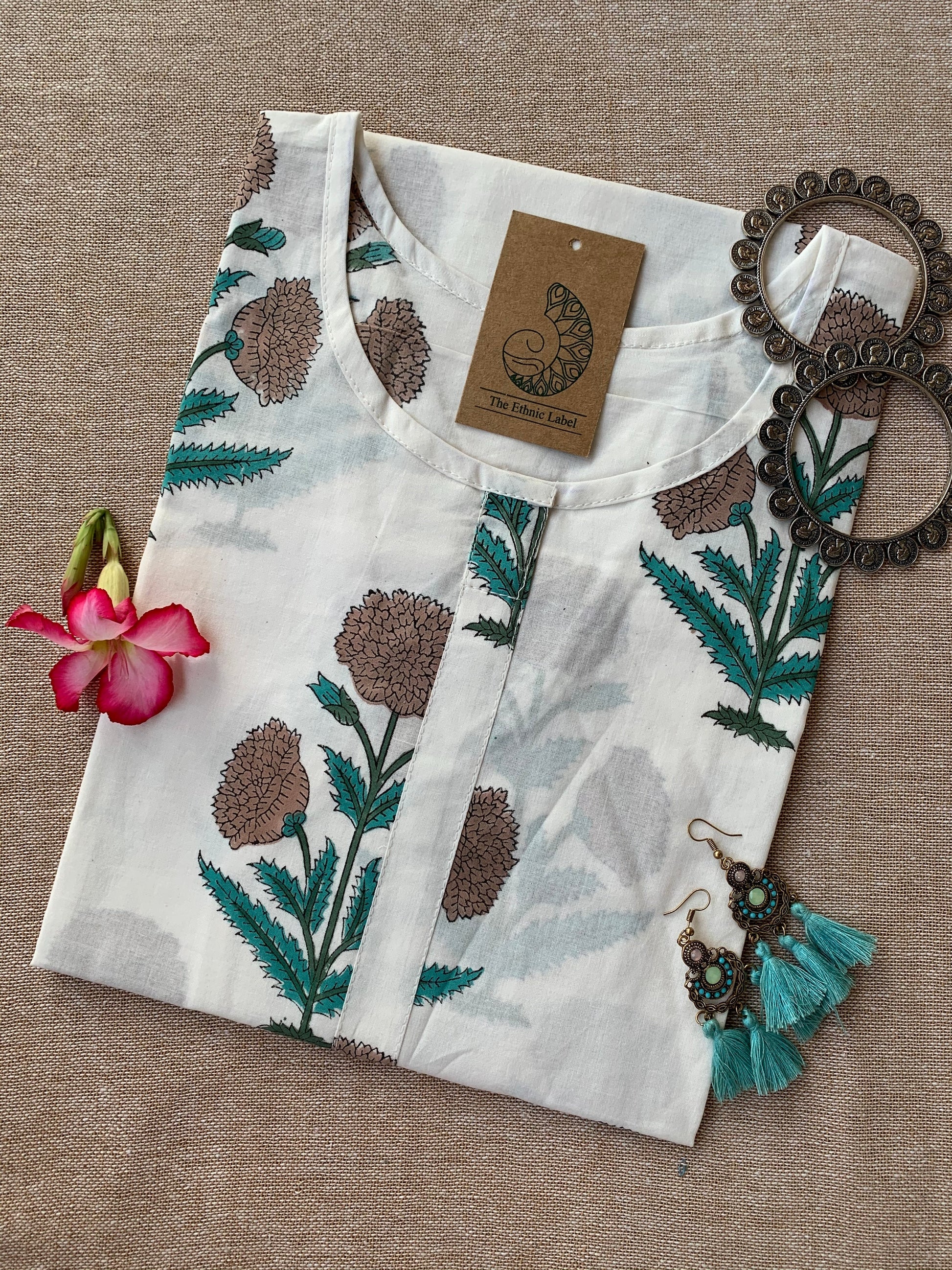 White Mughal Sea Green Boota Hand Block Printed Cotton Kurta